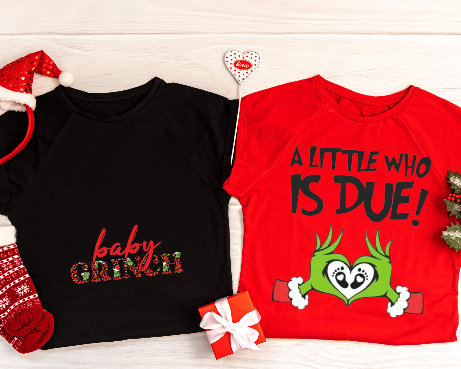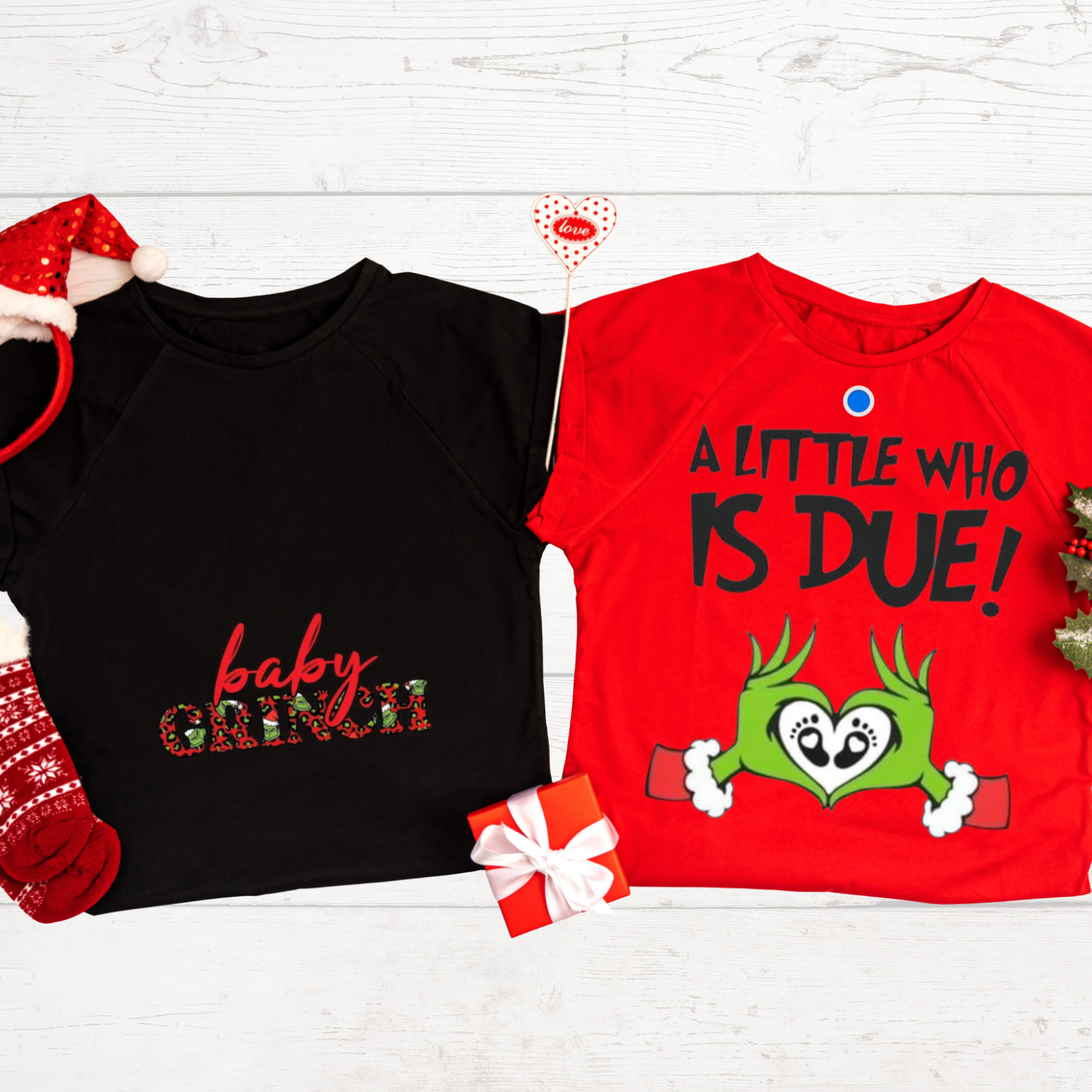 "Baby Grinch" or "A little Who is Due" shirt. Introducing the "Baby Grinch" and "A Little Who is Due" T-shirts, perfect for expecting parents! Made with high-quality materials, these shirts feature a cute design that celebrates the arrival of a new little one. Comfortable and stylish, they make a great gift for baby showers or to announce the exciting news.