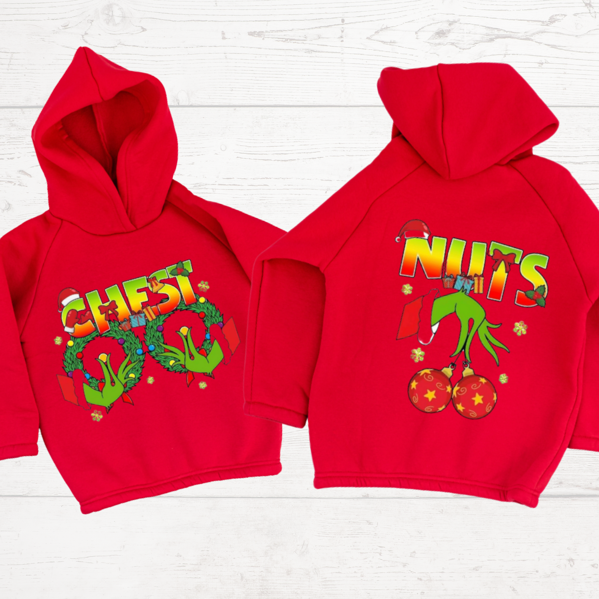 Boost your humor game with our "Chest - Nuts" hoodies! This humorous couple's hoodie features a playful play on words with "Chest" and "Nuts", perfect for showcasing your fun and witty side. Made with comfortable materials, you'll feel both stylish and cozy in this unique hoodie.