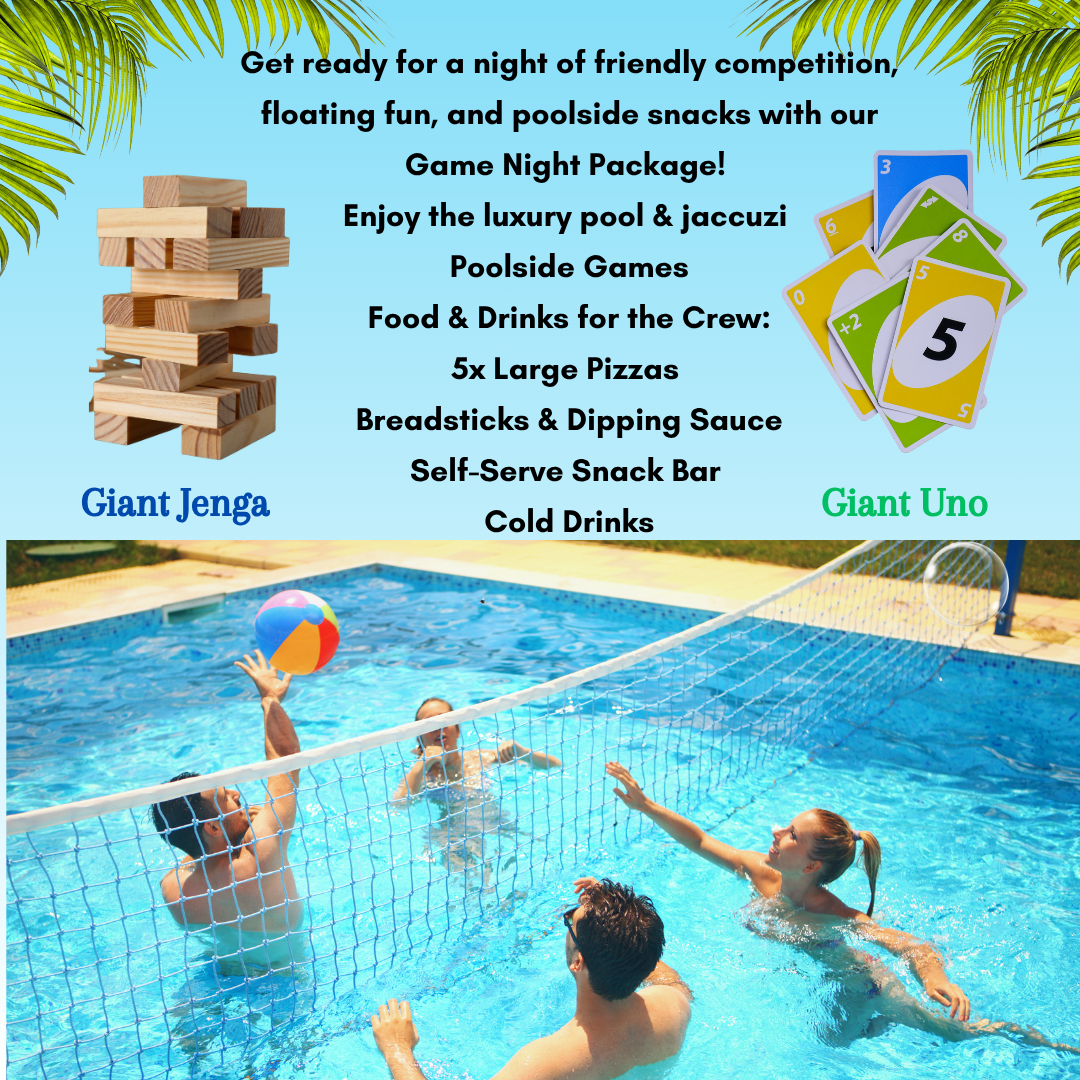 Get ready for a night of friendly competition, floating fun, and poolside snacks with our Game Night Package! Perfect for groups of up to 20, this party setup brings everyone together for laughter, team spirit, and unforgettable memories.