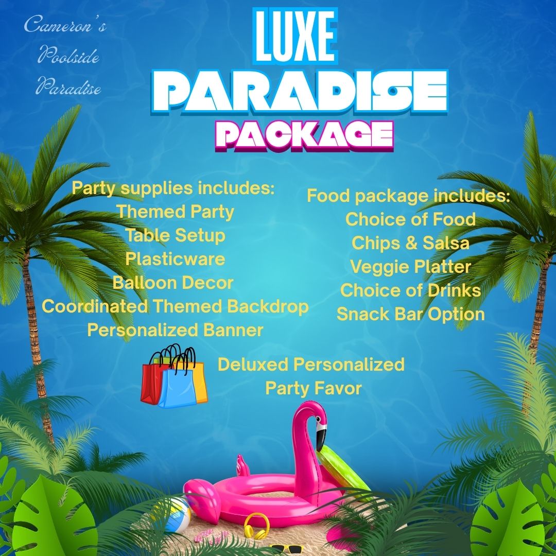 Go all out with our Luxe Paradise package. Designed for stylish, full-service celebrations, this package brings the wow factor with deluxe decorations, personalized touches, and upgraded favors.