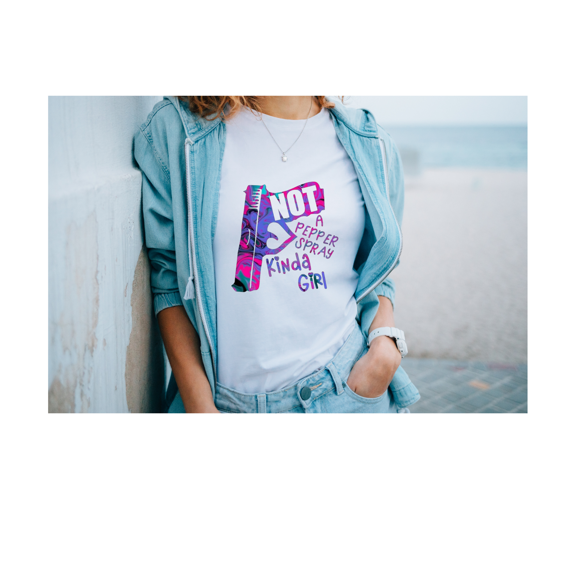 Stand confidently with the "Not a Pepper Spray Kinda Girl" shirt—a bold statement of strength and resilience. This comfortable, stylish tee empowers you to embrace your own way of staying safe and strong without compromise. Perfect for those who make personal safety a priority.