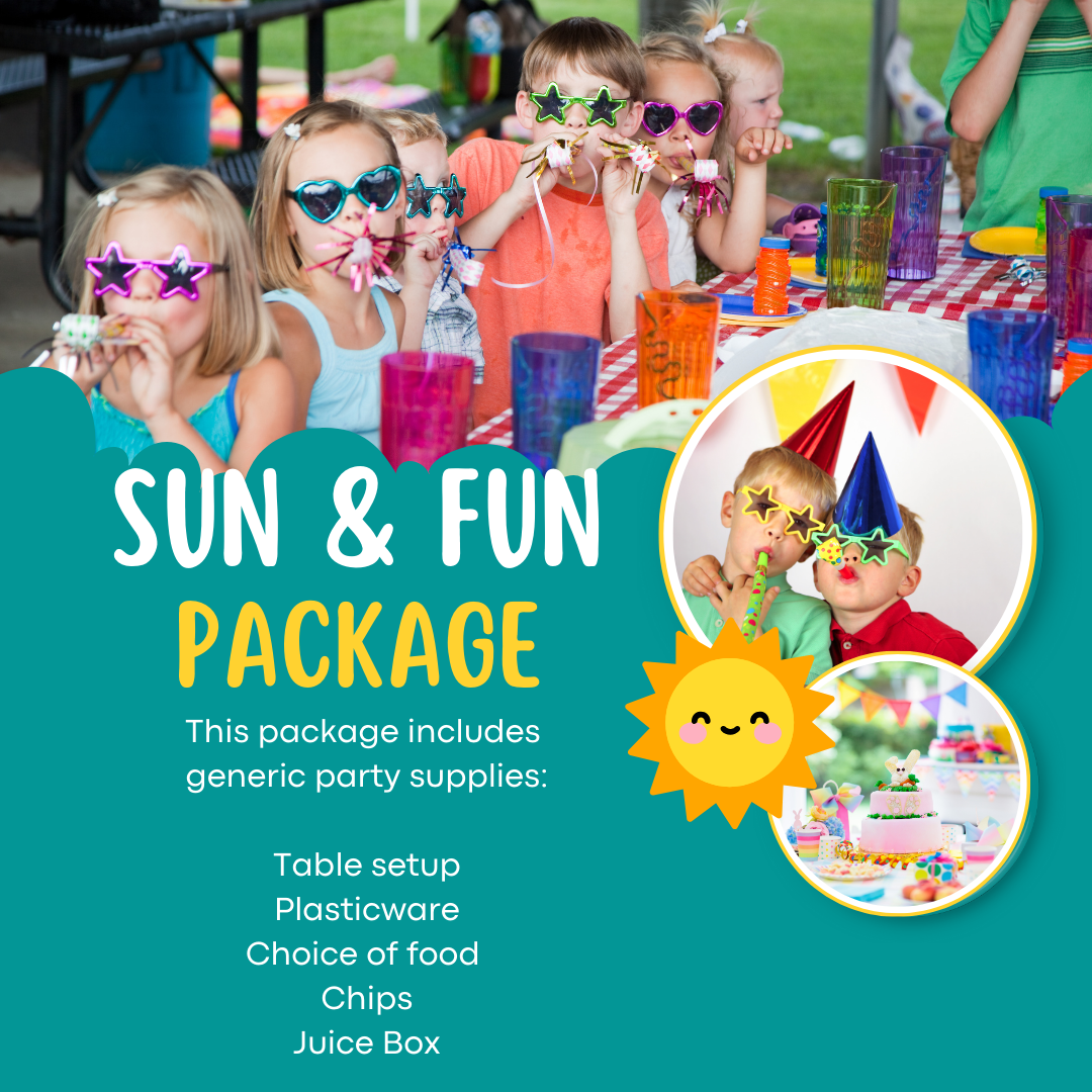 The Sun & Fun party package will get you started with your basic needs for throwing a fun party for your little one. It includes your basic color choice, supplies, food and drinks. Just choose your favorite color and food in the drop down menu.